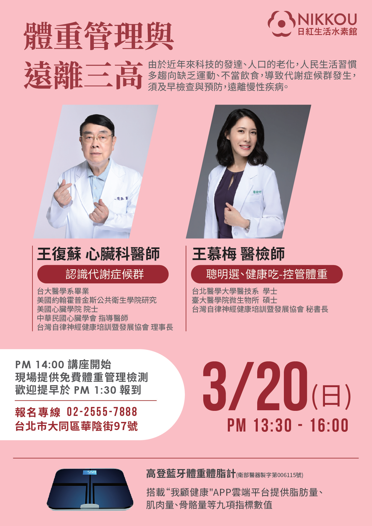 體重管理與遠離三高 講座名稱:體重管理與遠離三高 講座時間:2022.03.20 (日) 13:30-16:00 講座地點:台北市大同區華陰街97號 報名連結: https://www.surveycake.com/s/16oml 報名簡章: 請點此 上一篇 下一篇 回上層