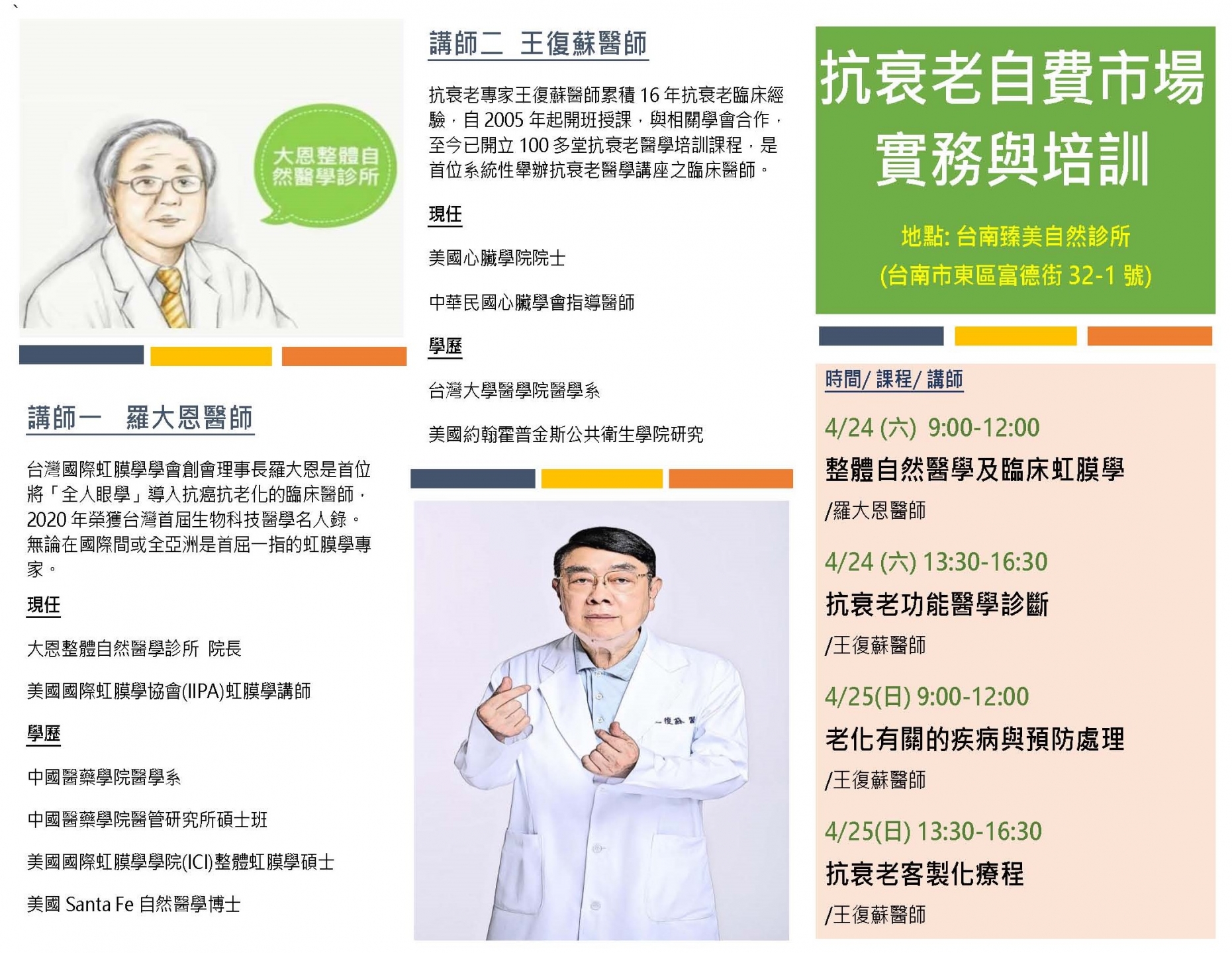 抗衰老專家王復蘇醫師舉辦抗衰老培訓課程(第二場) 講座名稱:老化有關的疾病與預防處理 講座時間:2020.08.23 (日) 09:00-12:00 講座內容:老化有關的疾病與預防處理 講座地點:喜悅健康診所 (台北市中山區龍江路152號B1) 報名連結: https://forms.gle/yn592k4RZD91zhFs9 報名簡章:請點此 上一篇 下一篇 回上層