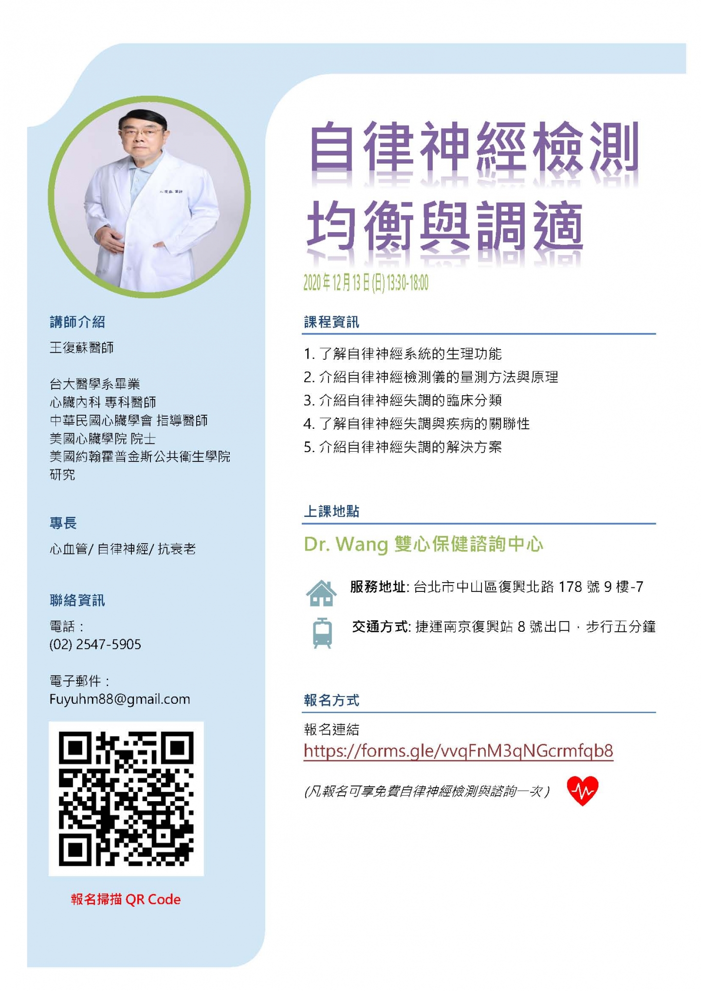 自律神經專家王復蘇醫師舉辦自律神經衛教講座(第四場) 講座名稱:『氫』鬆遠離自律神經失調 講座時間:2020.08.02 (日) 13:00-16:00 講座內容: 透過自律神經檢測了解自身的心跳率變異度(HRV) 藉助氫分子療法與營養補充改善自律神經失調 講座地點: 台北市大安區忠孝東路216巷27弄16號B1 報名簡章:請點此 上一篇 下一篇 回上層