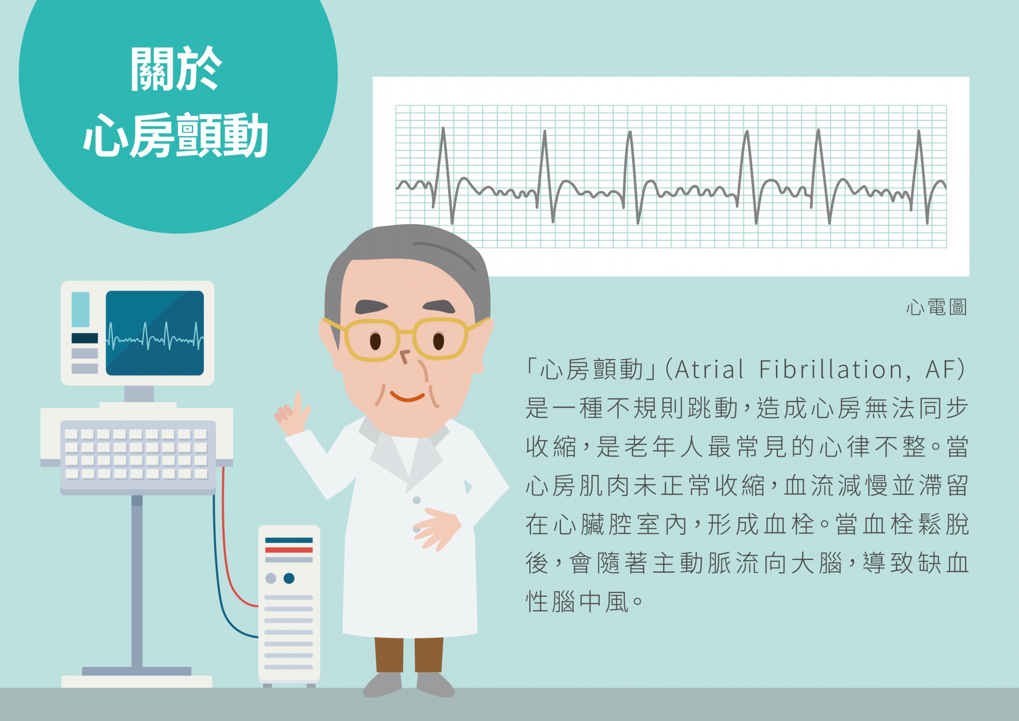 臨床上心房顫動分為三種。第一種,「突發性心房顫動」,大多在幾個小時內自行消失;第二種,「持續性心房顫動」,發作期間起過七天以上,大多需要藥物治療或電燒治療;第三種,「永久性心房顫動」,發作期間超過一年,需要用射頻電燒方法才能控制下來。