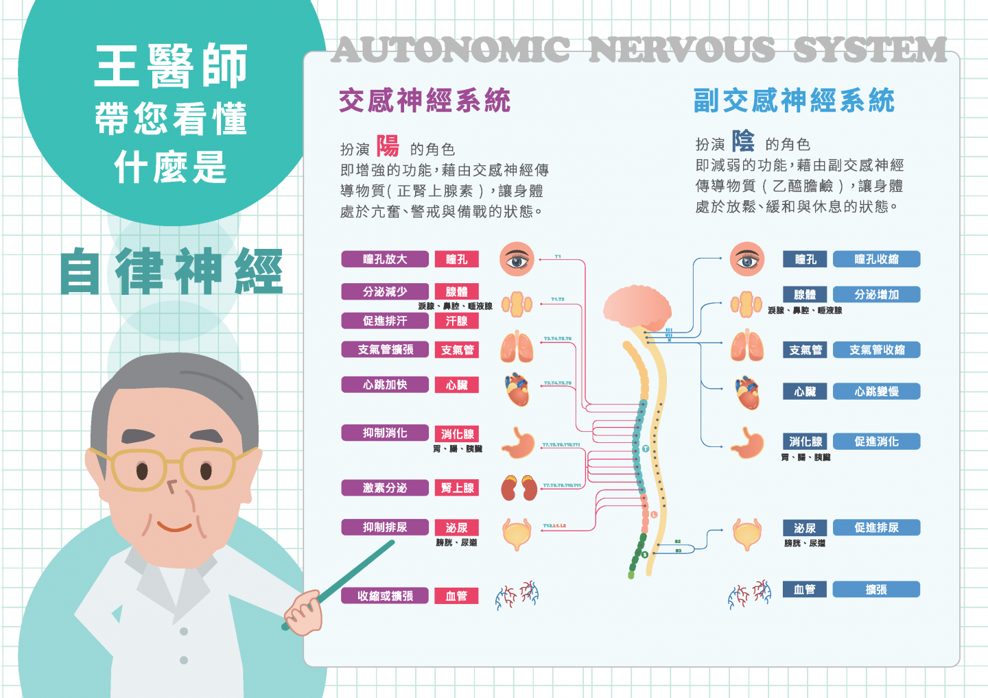 控制身體五臟六腑功能的神經系統,我們稱之為「自律神經」。它不受大腦意識控制,可以調控人體的體溫、血壓、心跳、腸胃蠕動、腺體分泌、排泄與生殖功能等。自律神經可以分為「交感神經」和「副交感神經」兩大系統;交感神經的傳導物質為「正腎上腺素」,可以讓身體處於亢奮、警戒與備戰的狀態,而副交感神經的傳導物質為「乙醯膽鹼」,主要功能是讓身體處於放鬆、緩和與休息的狀態。 了解更多 專業諮詢 上一篇 下一篇 回上層